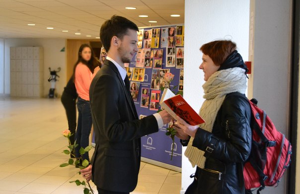 В то же время парни ЕГУ затеяли другую акцию, приуроченную к международному женскому дню: они решили поздравить каждую девушку в университете, подарив розу.