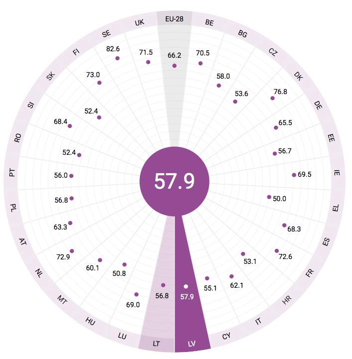 В новом Европейском индексе гендерного равноправия Латвия набрала 57,9 пунктов, заняв 17-ое место среди стран Евросоюза. Результат Литвы — 56,8 пунктов, Эстония набрала 56,7 пунктов.