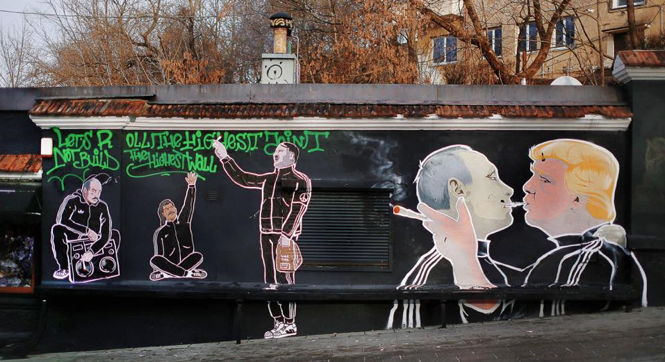 На стене ресторана Keule Rukе также располагается знаменитое граффити с Путиным и Трампом, которые вдувают друг другу дым «косяка».