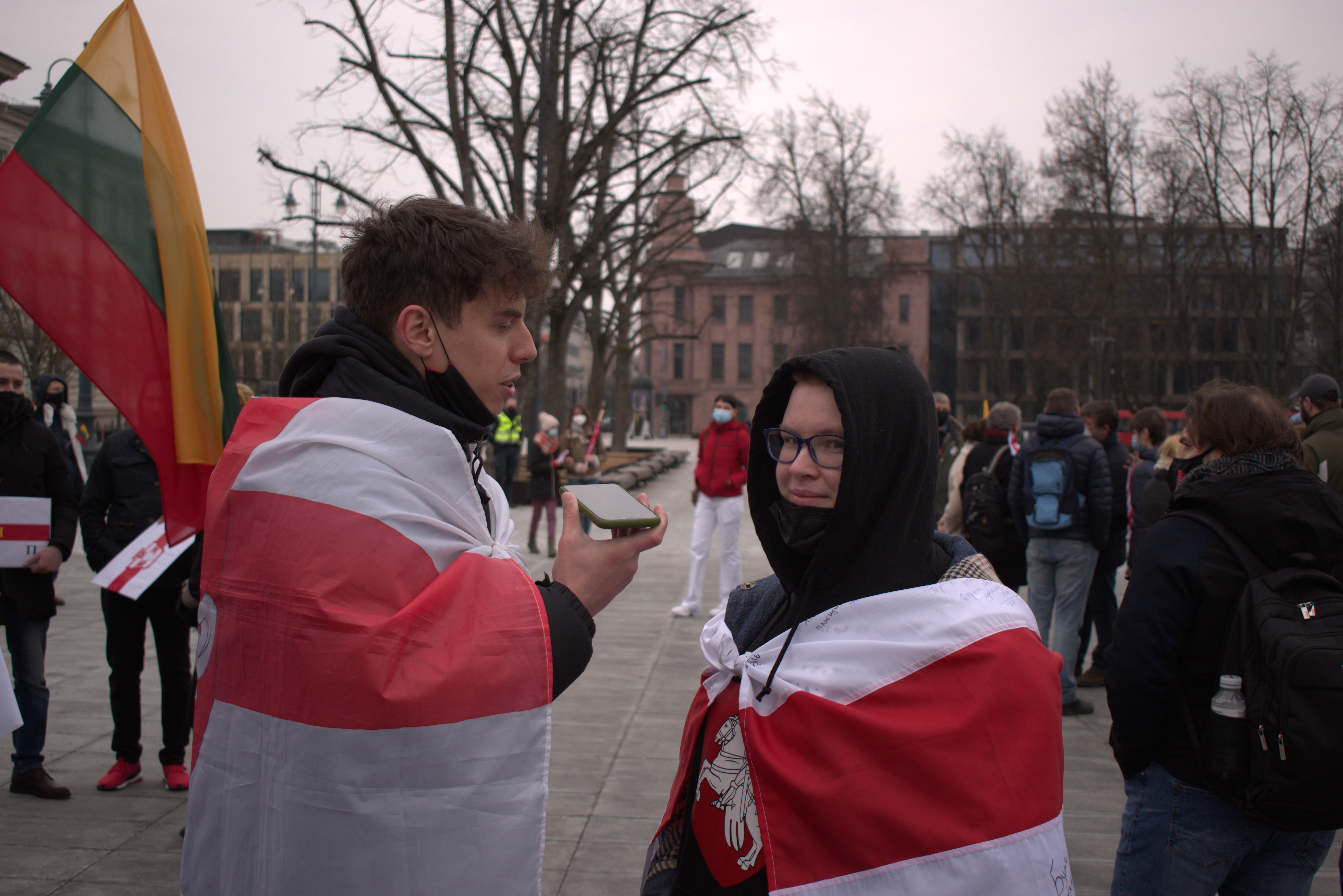 Некоторые люди действительно относятся плохо к белорусам, но, конечно, нету такого, чтобы это были многие. Есть один человек, который сегодня на акции присутствует, ходит, снимает и говорит всем, какие они плохие (прим. автора: Маргарита говорит про автора YouTube канала «литовец рубит правду» Лауринаса. Зачастую он провоцирует людей на конфликт и распространяет ложную информацию). Но большинство людей в Литве, конечно, прекрасно относятся к белорусам, к тому, что они делают. и мне кажется, что это потрясающе».