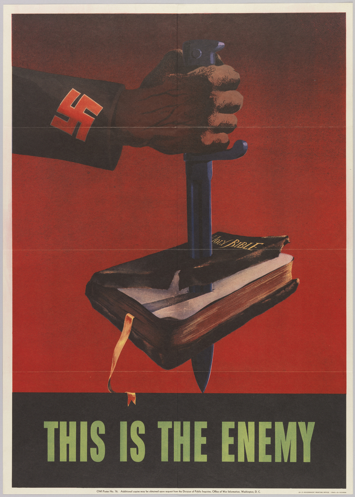 Дегуманизация врага, а именно представление его в виде безбожной силы, борющейся с христианством – также частый нарратив в корыстном визуальном убеждении: