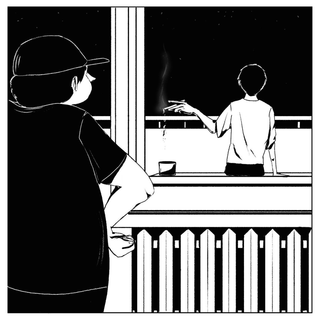 «Да покурить я пришёл, чё… », — оправдался Лёша и, достав пачку сигарет, пошел на балкон. Он открыл дверь, и на кухню ворвался сквозняк, который громко хлопнул входной дверью. Лёша закрылся на прохладном балконе и, пританцовывая в дешёвых тапочках, закурил.