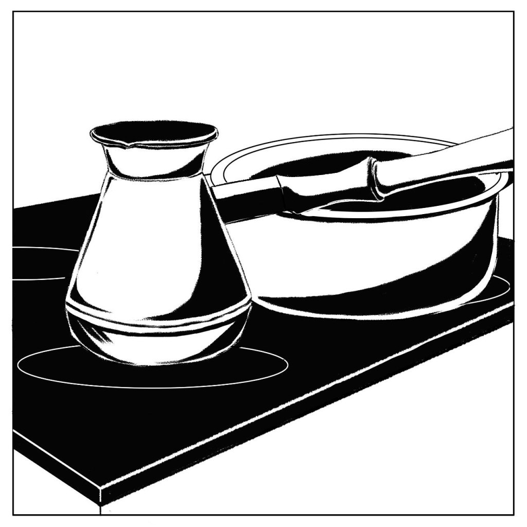 Девочка залила воду в кофеварку, засыпала кофе и поставила её на огонь. В соседней кастрюле бурлило подозрительно мало воды, где-то на одну кружку.