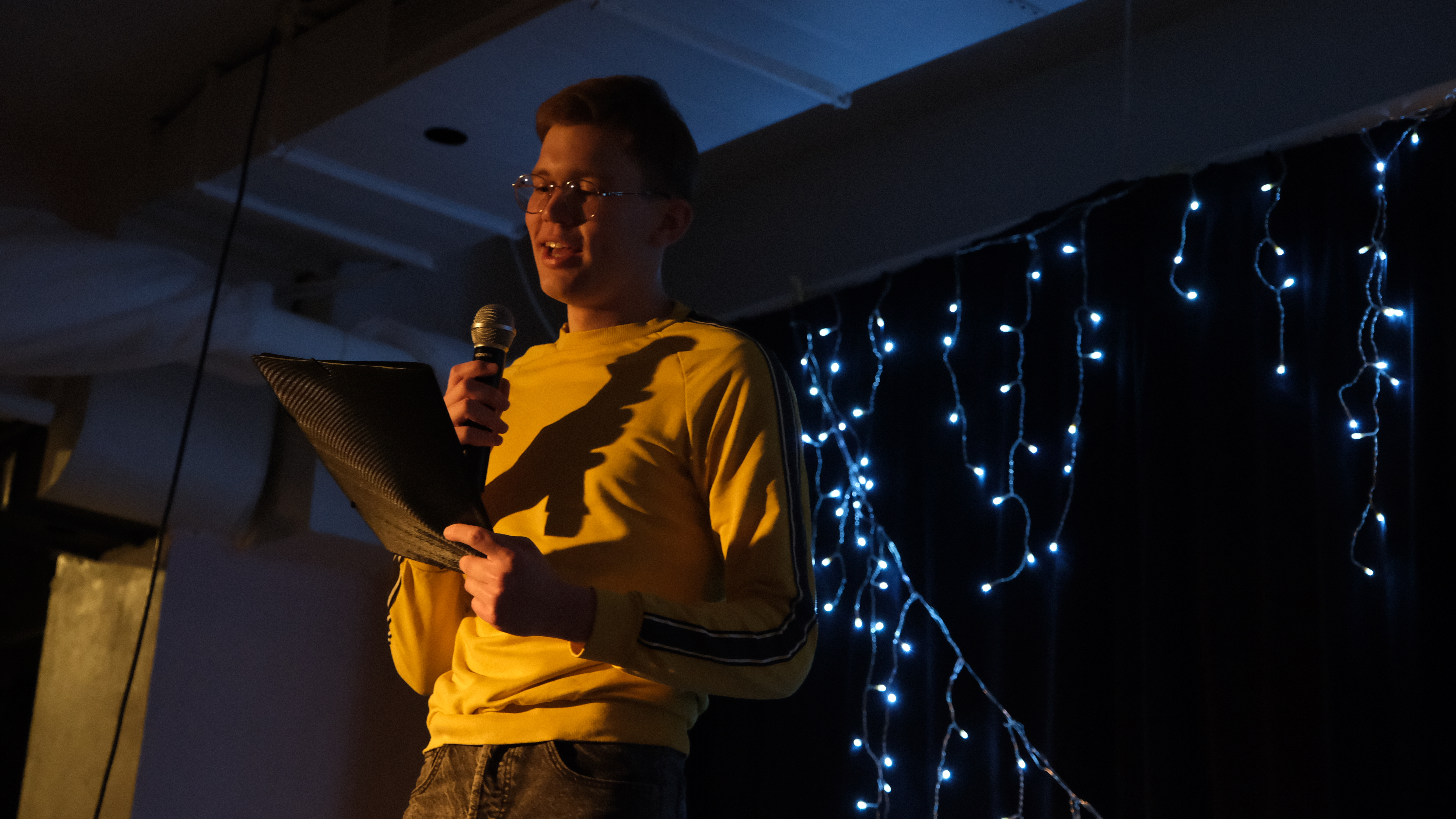 Коля: «Было боязно идти в дело, в котором у тебя не было никакого опыта. Но вперёд двигало любопытство и хорошая компания. Несколько раз думал отказаться из-за сомнений по поводу материала, плюс ко всему еще и простыл перед выступлением. Но все прошло гладко, и я остался доволен результатом.