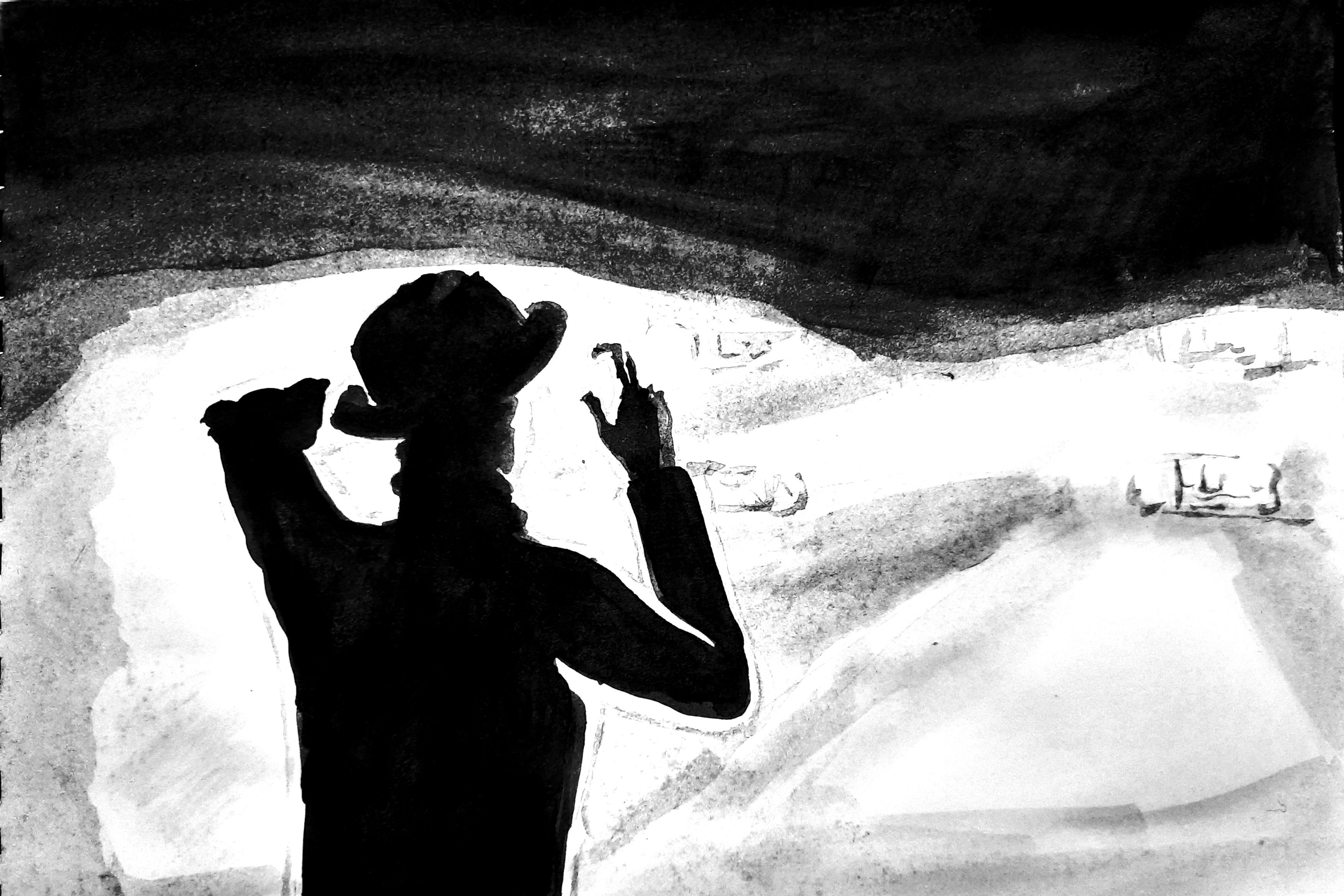Тут из плотного тумана стали доноситься отдалённые постукивания о тротуар. Словно старый джентльмен отбивал ритм носиком зонта у своих ног. Звуки стука потихоньку приближались к иллюстратору. Тот стоял в неловком ожидании. Было заметно, как его рука с папиросой слегка задрожала. Вместе со стуком стали слышны легкие, но уверенные шаги. Из тумана на иллюстратора вышла тонкая фигура с деревянной палочкой.