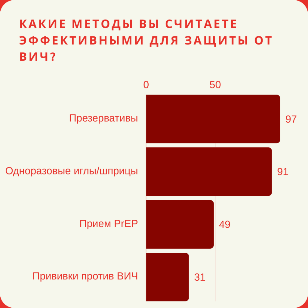 Почти треть студентов (31%) ошибочно полагает, что прививки против ВИЧ, которых в настоящее время не существует, являются эффективным методом. Это может говорить о путанице в отношении существующих профилактических мер. Разработка такой вакцины является сложной задачей из-за уникальных свойств вируса, включая его способность мутировать и адаптироваться к иммунной системе носителя.