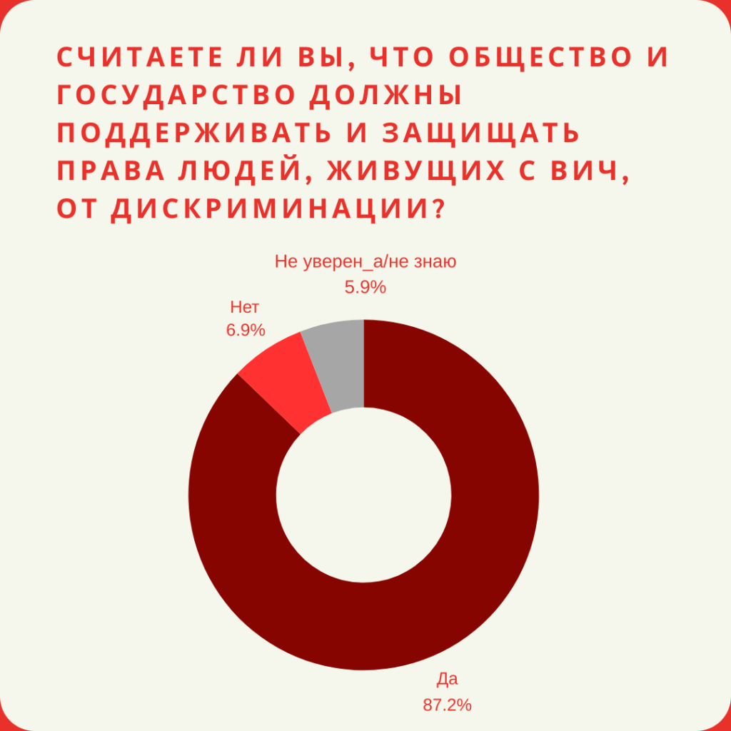 Большинство опрошенных студентов_ок (87.2%) считают, что общество и государство должны поддерживать и защищать права людей с ВИЧ. Самой популярной мерой, которую поддерживают респонденты_ки, является проведение образовательных кампаний и противодействие стигматизации (88%). Создание социальных программ для людей с ВИЧ также видится важным шагом (66%), в то время как законодательные меры против дискриминации (28%) поддерживаются меньше. Только небольшое количество респондентов_ок (4%) считают, что дополнительные меры вовсе не нужны.