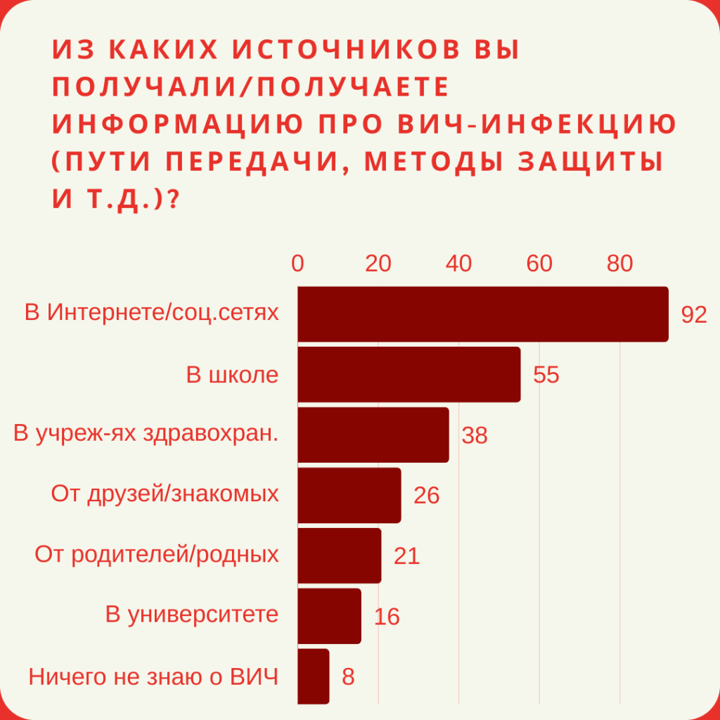 Школы также являются важнейшим источником информации (55%), что подчеркивает роль образовательных учреждений в медицинском и антидискриминационном просвещении, в то время как университеты (16%) в существенно меньшей степени делают вклад в просвещение студентов по данной тематике, что может говорить о необходимости расширения программ о ВИЧ в университетской среде.