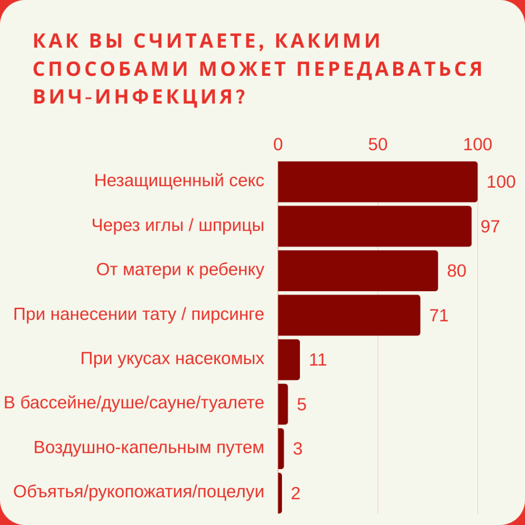 Почти все респонденты_ки знают, что незащищенный секс (100%) и совместное использование игл/шприцов (97%) являются путями передачи инфекции. Большинство также правильно определяют, что вирус может передаваться от матери ребенку (80%) и при нанесении татуировок/пирсинга нестерильным инструментом (71%).