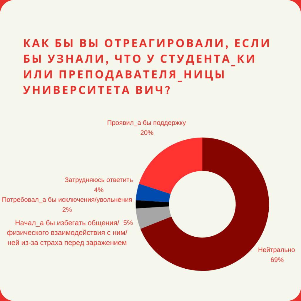 Большинство респондентов_ок (76.2%) считают, что дискриминация в отношении людей, живущих с ВИЧ, существует. 69% респондентов_ок отреагировали бы нейтрально на новость о ВИЧ-статусе студента_ки или преподавателя_ницы, что может отражать либо уровень информированности и толерантности, либо отсутствие эмоционального отклика на такого рода информацию.