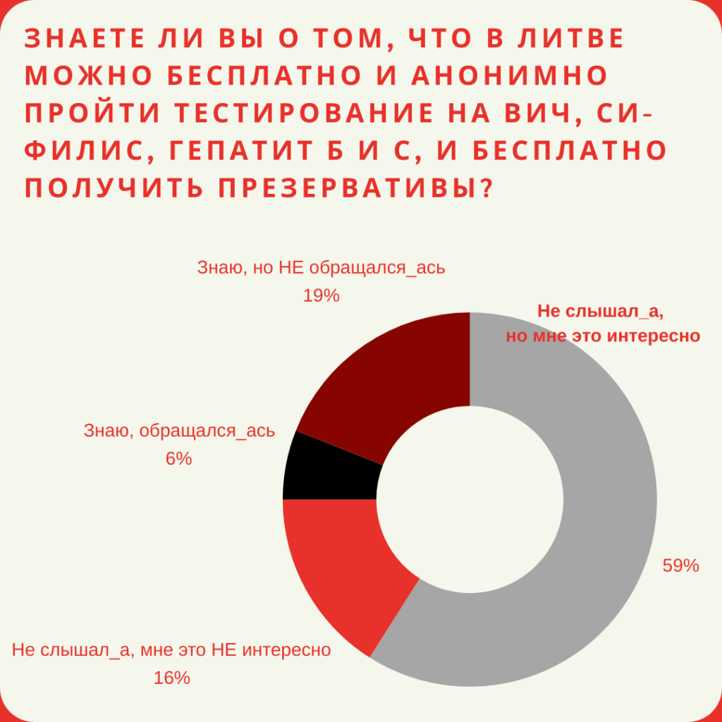 59% студентов_ок выразили интерес к возможности прохождения тестирования в Литве. В Вильнюсе центр «Demetra» (Kauno g. 6) предоставляет возможность бесплатного и анонимного тестирования на ВИЧ, а также на сифилис и гепатиты B и С. Это важный источник поддержания сексуального здоровья населения и профилактики распространения инфекций.
