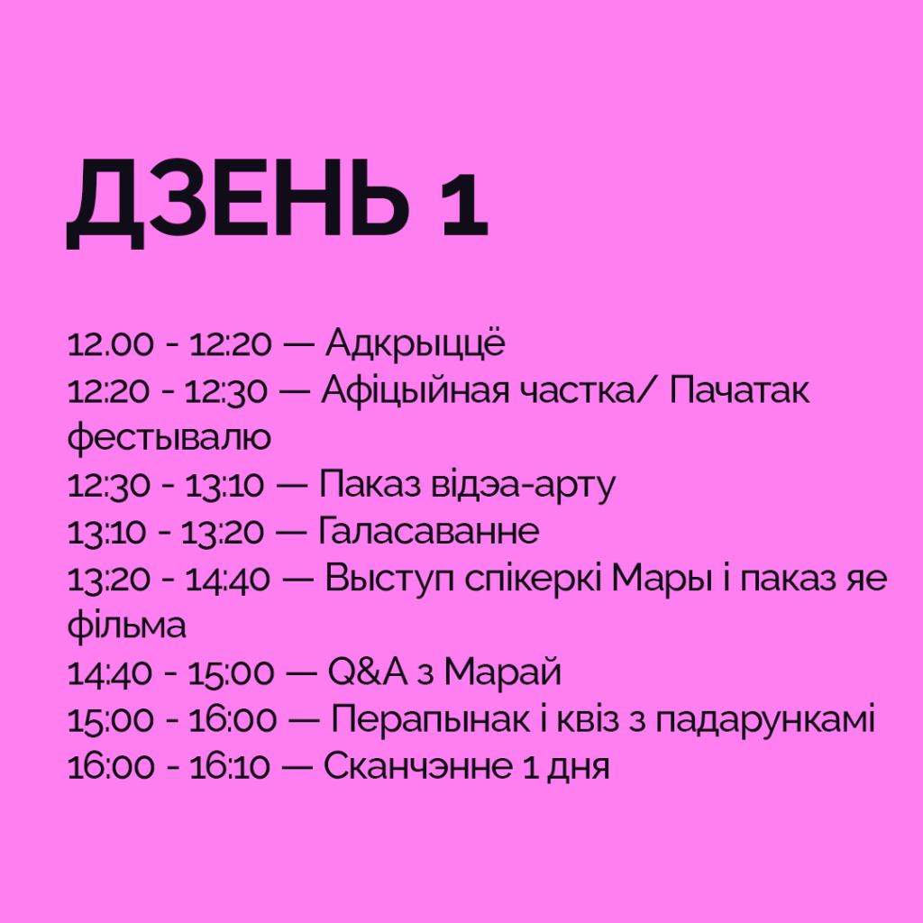 Наш фестываль будзе праходзіць 2 дні. За гэты час мы плануем паказаць больш за 10 фільмаў маладых кінематаграфіст_ак і правесці 2 лекцыі з прафесіянал_камі індустрыі.