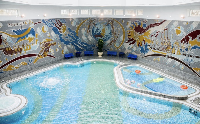- Лета – цудоўная нагода паглядзець на яшчэ адну мазаіку Кішчанкі, якая размяшчаецца ў залі з басэйнам гасцініцы «Беларусь» па адрасе Старажоўская, 15. Гэта адна з самых светлых і натхняльных мазаік аўтара – жоўтыя і блакітныя колеры, выявы вады, птушак, людзей і сонца. Вядома, ва ўнікальным стылі мастака.
