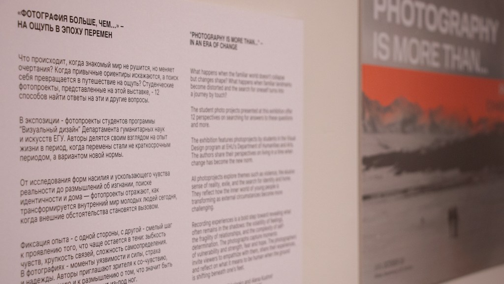 Мероприятие было организовано Сергеем Михаленко при поддержке Департамента гуманитарных наук. Сергей — фотограф, куратор и преподаватель на программе «Визуальный дизайн». В экспозицию выставки вошли 12 работ, которые студенты_ки создали в рамках курса «Визуальная выразительность: основы фотографии». Каждый проект рассказывает свою историю о внутренних страхах, переживаниях, ожиданиях и надеждах участников_ниц — Сергей смонтировал фотографии, превратив стены корпуса в настоящее произведение искусства; для наших студентов_ок это стало уникальной возможностью увидеть свои проекты в ином, действительно профессиональном виде, ведь фотопроекты погрузились в настоящее галерейное пространство.
