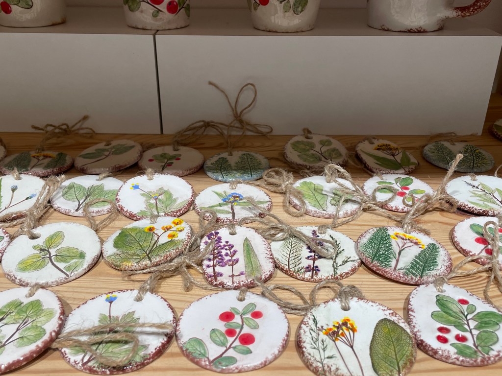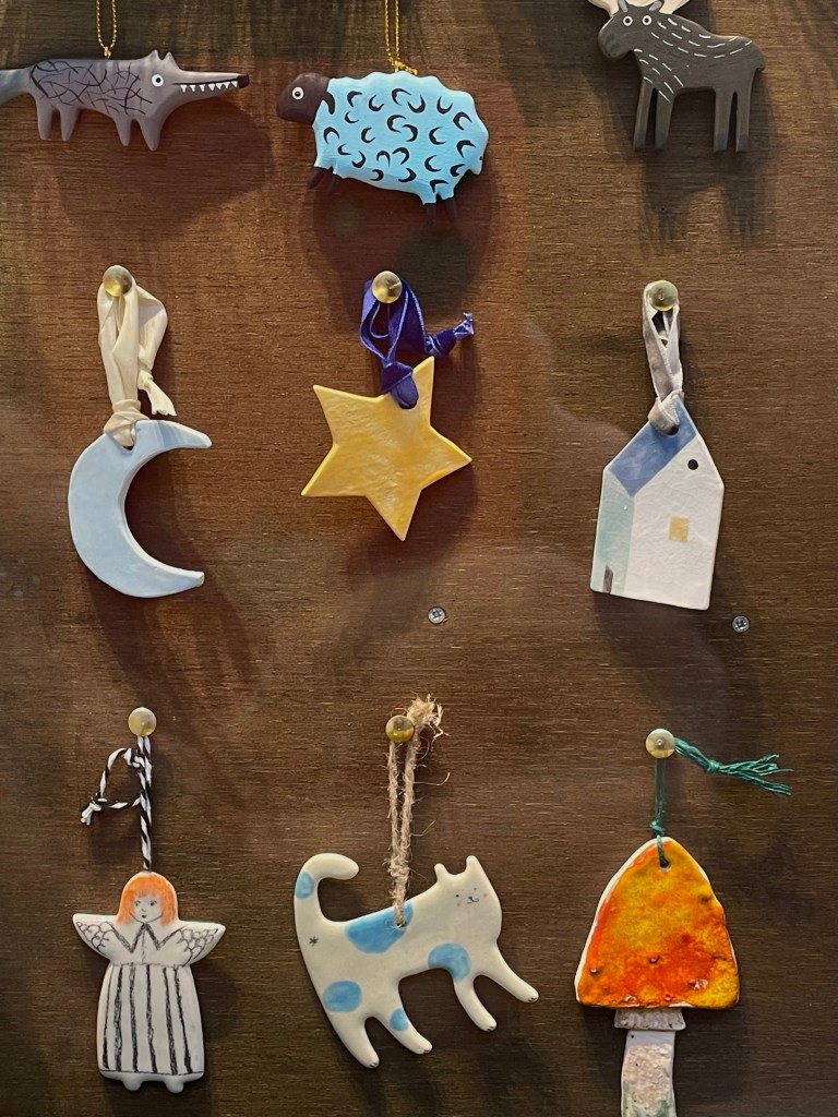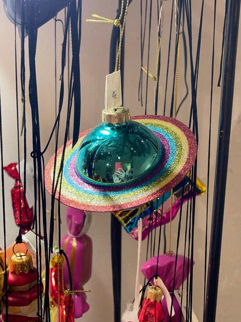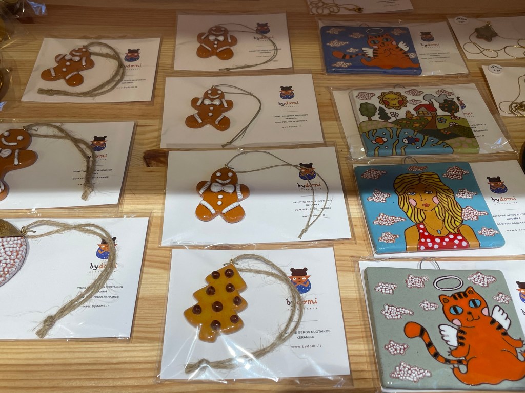 Прогуливаясь по близлежащим улицам, в нескольких метрах от предыдущего места я нашла галерею, в которой преимущественно находятся изделия художников из Ужуписа — это место также не обошла стороной рождественская суета. Галерея — прекрасное место для подбора подарков, особенно если человек любит уникальные, авторские ювелирные украшения. Что касается елочных игрушек, выбор там, по правде говоря, не такой уж большой — но любопытный! Стоимость одной керамической елочной игрушки — 18 евро; она может послужить необычным и памятным подарком себе или другим.