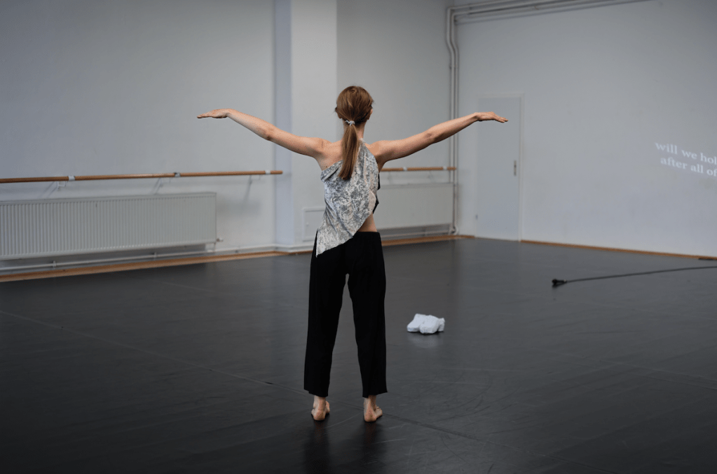 Работа соединяет текст, движение и специально созданный костюм. Слои костюма отражают разные уровни тела — физический, эмоциональный и невидимый. Фрагменты текста складываются в прерывистый поток мыслей — так, как мы переживаем утрату: не линейно, а через возвращения и паузы.