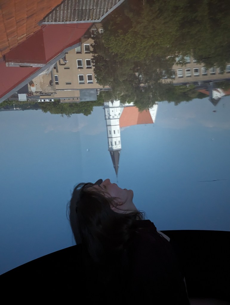 Милана: По факту это просто большая и черная изнутри банка, в которой есть одно маленькое отверстие, пропускающее свет. И вот за счет этого город проецируется вверх тормашками.
