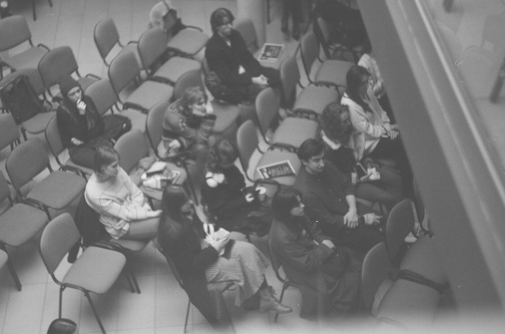 Милана: У меня это была конференция, посвященная фотографии. Нам преподаватель в качестве задания сказал: «Вот вы идете вместо пар, все снимаете и потом делаете отчет». Моя первая пленка была абсолютно ноунейм, непонятно чья вообще. Мне сказали, что там ISO либо 200, либо 400, поэтому надо снимать что-то средненькое. Но по итогу она мягкая по цветам и получились забавные ракурсы конференции.